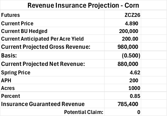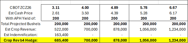 The current revenue is $878,000. Yet if the market were to head back to 4.00 futures, your revenue would decrease to 700,000. If the market declines to 3.11, your anticipated revenue would “bottom out” at $685,400 because your estimated insurance indemnification comes into play.