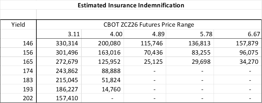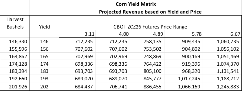 The next step in Grain Revenue Management is building a matrix providing a summary of anticipated revenue over an array of prices and yield changes. The revenue calculations are based on estimated insurance indemnification and estimated revenue on the sale of the remaining bushels at the stated futures price: